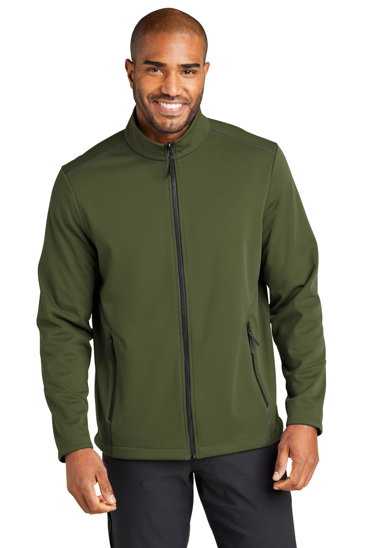 100% polyester knit shell with DWR finish bonded to water-resistant film insert and a 100% polyester brushed grid-texture, microfleece lining